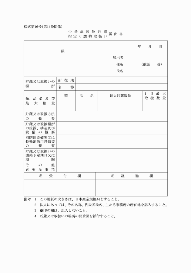第10条 条例第42条の3第2項の規定による屋外における指定催しを主催する者は、当該指定催しを開催する日の14日前までに(当該指定催しを開催する日の14日前の日以後に条例第42条の2第1項の指定を受けた場合にあっては、消防署長が定める日までに)火災予防上必要な業務に関する計画書(様式第3号)に条例第42条の3第1項各号に定める事項を記載した書類を添えて消防署長に届け出なければならない。