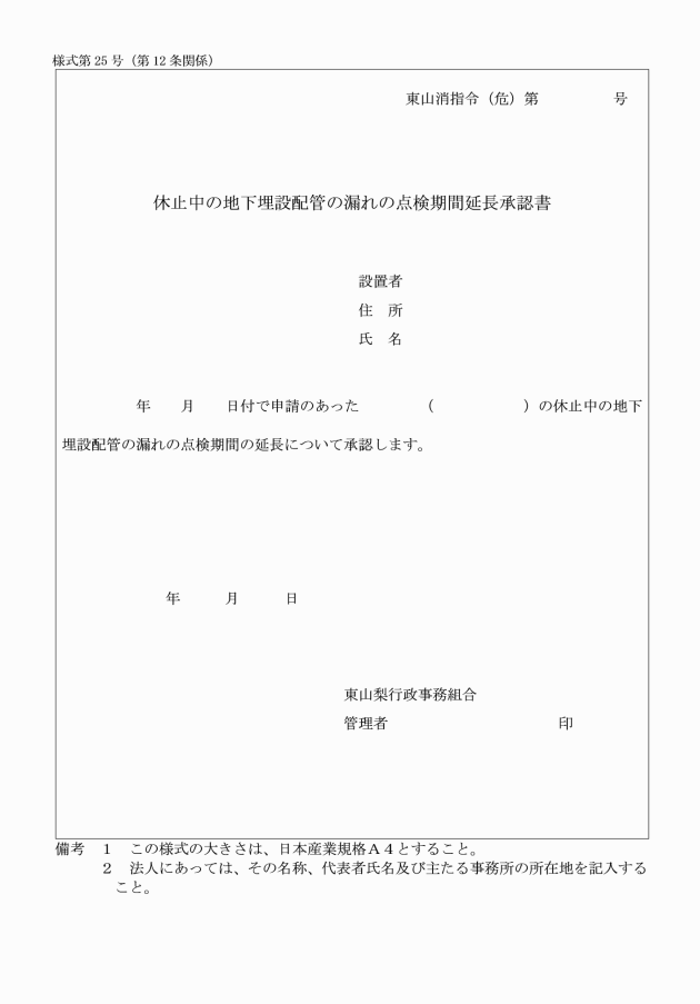 第3条 法第10条第1項ただし書の規定による指定数量以上の危険物を仮に貯蔵し、又は仮に取り扱おうとする者は、危険物仮貯蔵・仮取扱承認申請書(省令別記様式第1の2)により消防長に申請し、承認を受けなければならない。